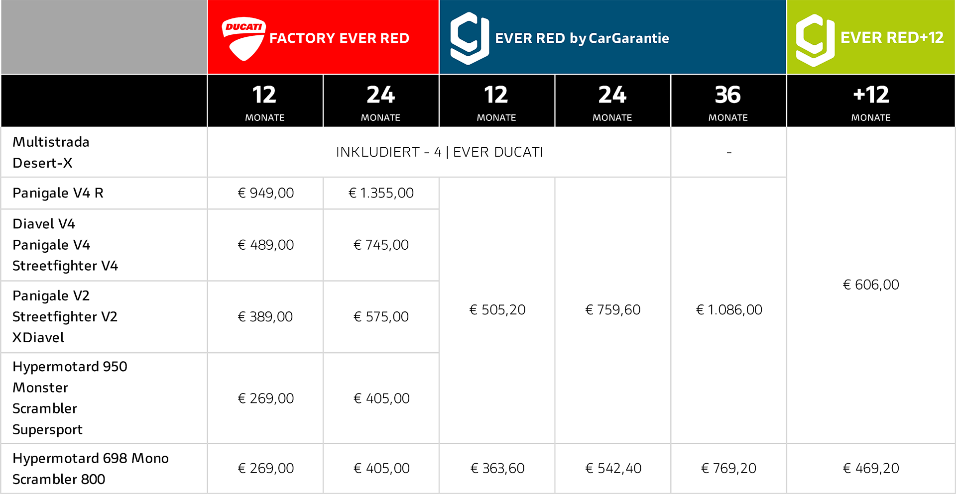 Ducati bietet auch die Möglichkeit die Herstellergarantie mit drei verschiedenen Produkten zu verlängern. Bei Wechsel des Eigentümers bleibt die Garantiedeckung bis zum Ablauf des gewählten Zeitraums bestehen. Aktiviere die Garantie noch heute und genieße den unbeschwerten Fahrgenuss mit Factory Factory Ever Red.